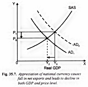 1. In the diagram, AD represents Aggregate Demand, SAS Aggregate Supply, Y shows the shift in the GDP and P the fall in price. 2. The price of USD-INR has fallen in the diagram that will lead to buying fewer goods & services than previously and as supply will not change in the short term, the short run Aggregate Supply (SAS) will meet the shifted Demand curve lower than previously. And hence, GDP will fall.